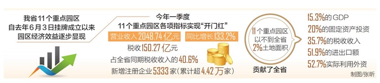 2020年,11个重点园区营业收入5067.82亿元,同比增长49.8%;税收收入395.38亿元,同比增长13.3%。GDP845.58亿元,同比增长20.3%。11个重点园区以不到全省2%土地面积,贡献了全省15.3%的GDP、20%的固定资产投资、35.7%的税收收入、51.9%的进出口额和52.7%实际利用外资,在我省经济增长中发挥了主力军作用。