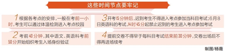 在疫情防控之外,省考试局还特别提醒考生注意几个时间节点:1.根据各考点的安排,一般在考前一小时,考生可以通过体温检测进入考点校园;2.考前40分钟,其中语文、英语科考前50分开始组织考生入场身份验证;3.开考15分钟后,迟到考生不得进入考点参加当科目考试;6月8日英语科的考试,14时45分起禁止迟到的考生进入考点参加考试;4.提前交卷不得早于每科目考试结束前30分钟,交卷出场后不得再进场续考。