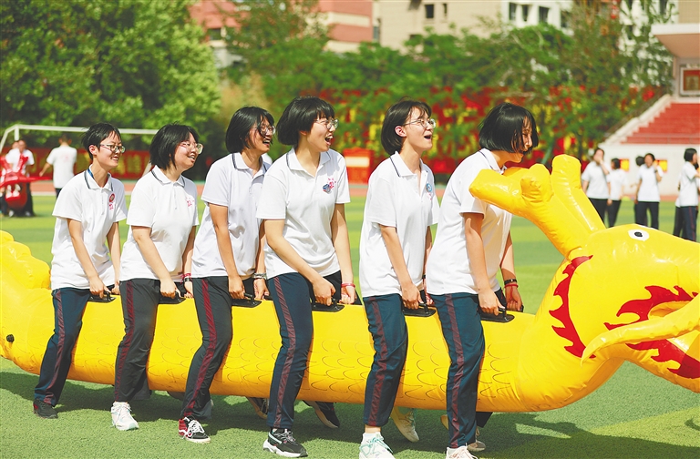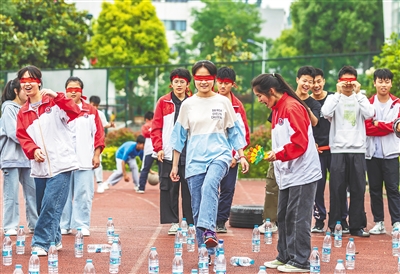 河北省衡水市第二中学高三学生在操场上参加趣味减压活动。 新华社发