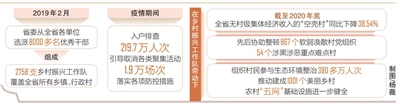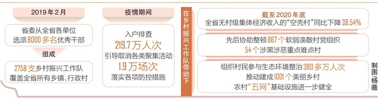 2020年春节前夕,新冠肺炎疫情暴发。在史无前例的大考面前,全省2758支乡村振兴工作队迅速进入“战时”状态,大年初三就返回驻点村,就地转化为防疫队、作战队:入户排查219.7万人次,引导取消各类聚集活动1.9万场次,认真落实各项防控措施,构筑起牢不可破的群防群治防线。