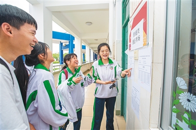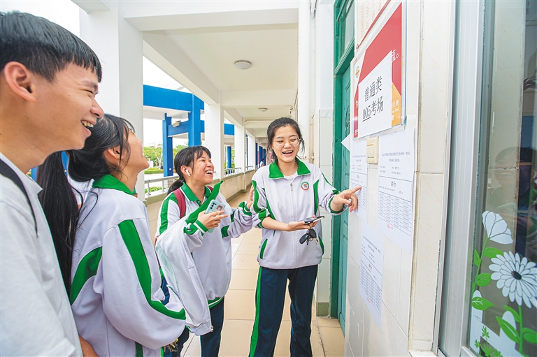 6月6日,全省各高考考点面向考生开放。图为在位于琼海市嘉积中学的高考考点,几位考生在考场外的信息表上寻找自己的座位,提前”踩点”看考场,熟悉环境。本报记者 袁琛 摄 (相关报道见A03版)