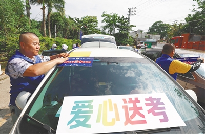 6月6日,在屯昌中学高考考点外,爱心司机张贴“爱心送考”标识。今年高考期间,屯昌组织“爱心送考车队”,为当地高考考生提供免费接送服务。