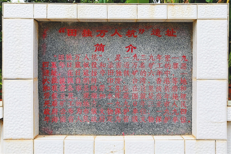 如今在颂和水库旁,有一片芳草萋萋的绿地,这里耸立着两座纪念碑。一座是1958年由海南铁矿田独矿区用水泥砌筑的“日寇时期受迫害死亡工友纪念碑”;另一座是2001年年初三亚市政府在原纪念碑旁新建的纪念碑,碑上刻着“田独万人坑死难矿工纪念碑”。