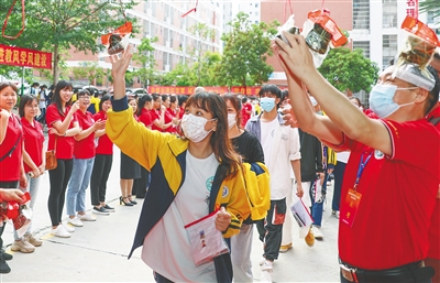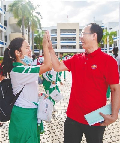 6月7日,琼海市嘉积中学考点,老师和考生击掌,鼓励学生轻松应考。 本报记者 袁琛 摄