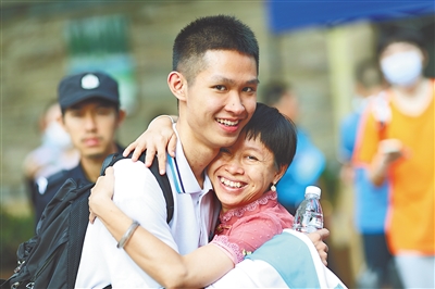 在海南中学考点,一名考生在进入考场前,母亲为他打气。 本报记者 封烁 摄