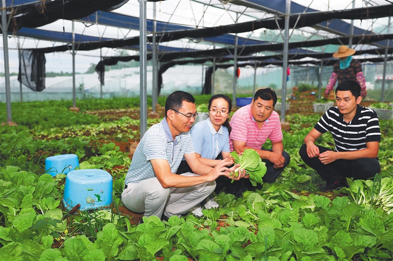 6月8日,在五指山市毛阳镇毛兴村,原驻村第一书记张文(左一)同新到的乡村振兴工作队队员查看蔬菜基地。