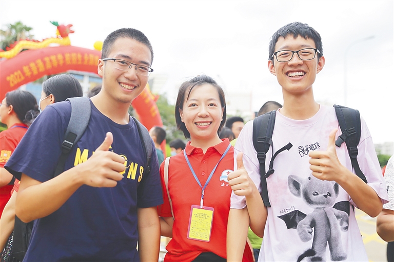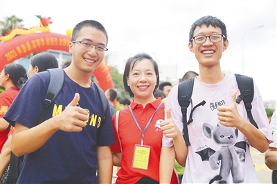 6月8日,海南华侨中学高中部考点,英语科目考试结束后,考生和老师合影留念。 本报记者 张茂 摄