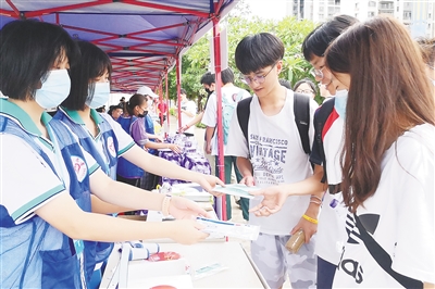 6月8日,海口旅游职业学校考点,志愿者为考生提供口罩。 本报记者 张茂 摄