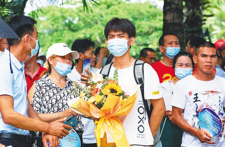 6月7日,在三亚市第一中学考点外,考生亲属手捧鲜花等待。 本报记者 武威 摄