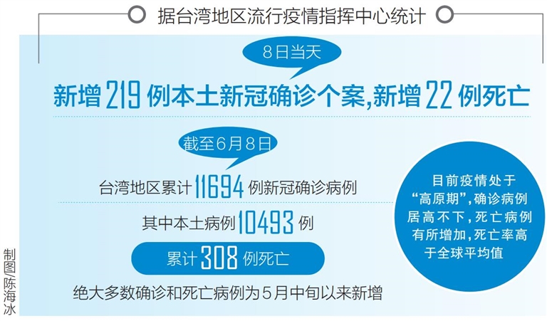 5月中旬本土疫情暴发以来,台湾新增本土病例逾万人,近300病例不幸死亡。台湾地区流行疫情指挥中心8日举行记者会公布,当天新增219例本土新冠肺炎确诊个案,确诊个案中新增22例死亡。台湾各界对民进党当局防疫部署提出诸多批评,也苦口婆心给予意见建议。舆论呼吁当局摒弃意识形态挂帅,回归科学专业防疫。