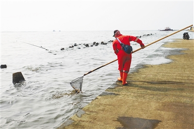 6月8日,一名工作人员在印度尼西亚雅加达岸边清理垃圾。