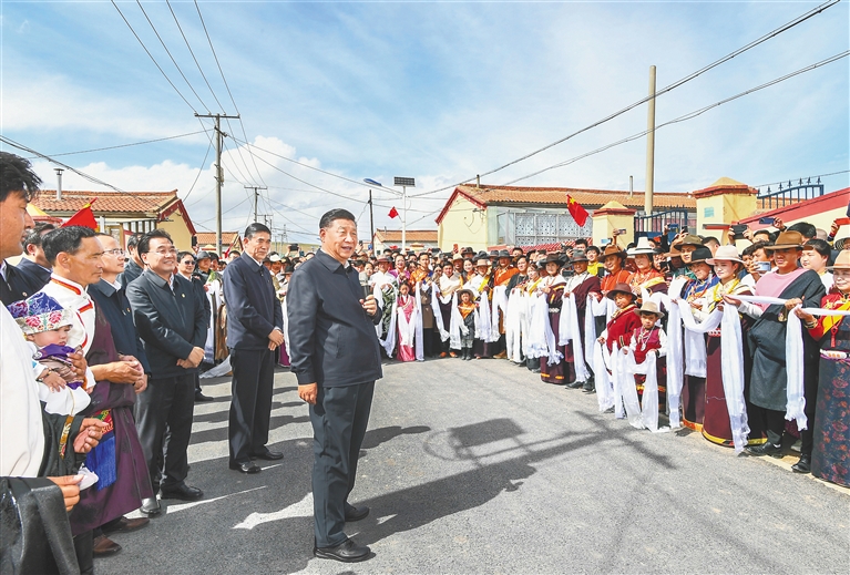 离开索南才让家,村民们看到总书记来了,热情地涌到路边,欢呼着向总书记问好。习近平动情地说,看到乡亲们过上幸福生活,我感到很欣慰。我们要继续奋斗,到新中国成立一百周年时中华民族一定能够更加坚强地屹立于世界民族之林。全面建设社会主义现代化国家,一个民族也不能少。在中华民族大家庭中,大家只有像石榴籽一样紧紧抱在一起,手足相亲、守望相助,才能实现民族复兴的伟大梦想,民族团结进步之花才能长盛不衰。习近平祝福大家“扎西德勒”。