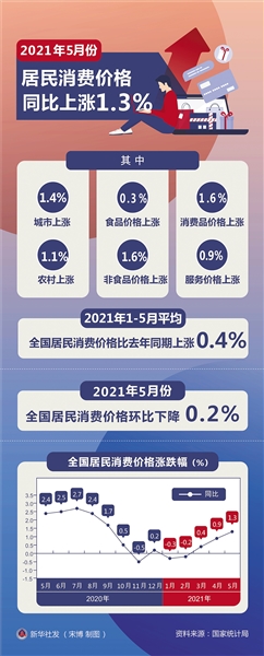 国家统计局9日发布数据,5月份,全国居民消费价格指数(CPI)同比上涨1.3%,保持总体稳定;全国工业生产者出厂价格指数(PPI)同比上涨9.0%,涨幅比上月扩大2.2个百分点。