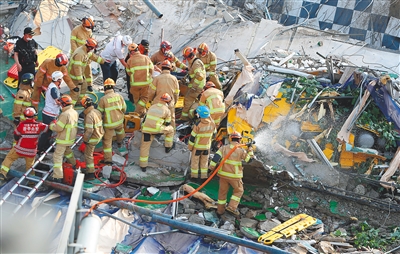 6月9日,消防人员在韩国光州建筑倒塌现场进行救援工作。