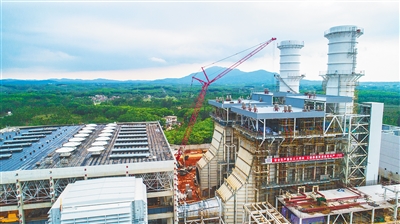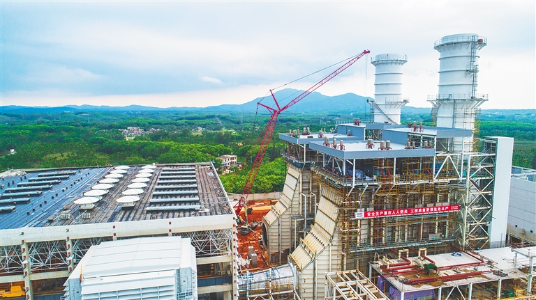 近日,俯瞰位于万宁市北大镇的大唐万宁燃气发电厂项目。目前,该项目正在加快建设,1号机组本月下旬进入调试阶段。
