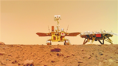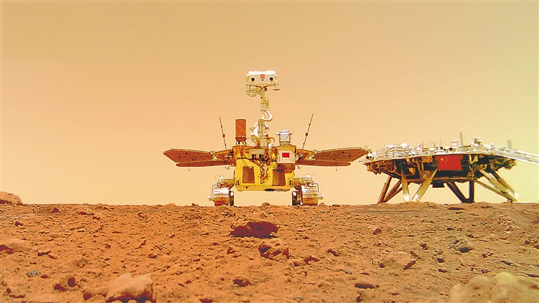 “着巡合影”图是火星车行驶至着陆平台南向约10米处,释放安装在车底部的分离相机,之后火星车退至着陆平台附近,分离相机拍摄的火星车与着陆平台的合影。图像通过无线信号传送到火星车,再由火星车通过环绕器中继传回地面。