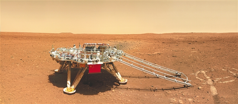 “中国印迹”图是火星车行驶到着陆平台东偏南60°方向约6米处,拍摄的着陆平台影像图。图像显示,着陆平台熠熠生辉,国旗鲜红方正,表面地貌细节丰富。