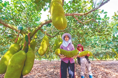 近日,在位于定安县黄竹镇的海南农垦南金农场公司波罗蜜标准化种植园,职工在采摘波罗蜜。再过半个月,当地波罗蜜将集中上市。文/本报记者 邓钰 图/本报记者 袁琛