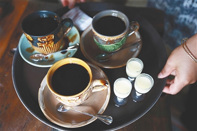 来到福山喝咖啡,大家感受着原汁原味的本土气息。厨房里,电磁炉上白亮的不锈钢茶壶烧着开水,沸腾后,加几勺深棕色的咖啡粉,边煮边搅拌,咖啡的浓香便瞬间霸占了周围的空间,诱惑着人们的味蕾。约10分钟,咖啡就煮好了,倒进白色的咖啡杯里。冒着热气的福山咖啡端上桌,食客们小抿一口,香醇浓郁留于唇齿间。