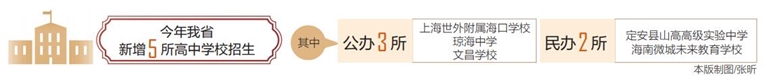 2021年我省新增5所高中学校招生,其中公办3所,分别是上海世外附属海口学校、琼海中学、文昌学校;民办2所,分别是定安县山高高级实验中学、海南微城未来教育学校。