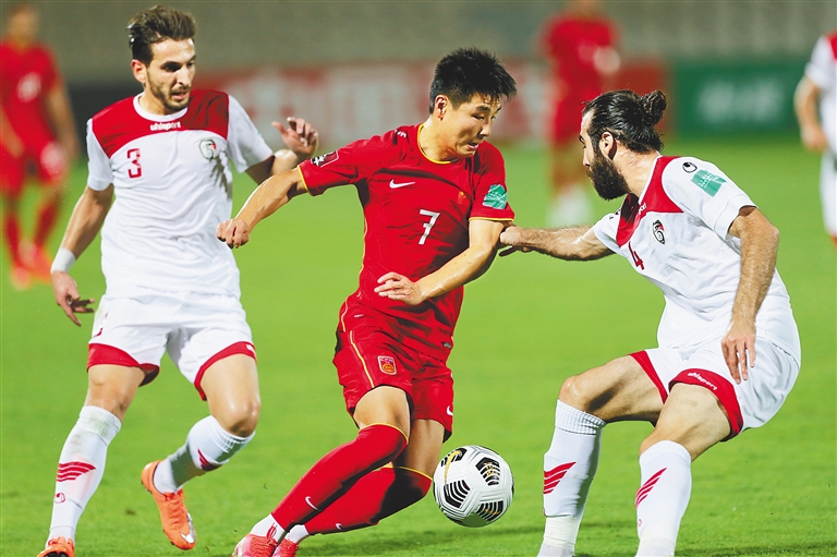 6月15日,在阿联酋沙迦举行的2022年卡塔尔世界杯亚洲区第二轮预选赛(40强赛)A组比赛中,中国队以3比1战胜叙利亚队,以小组第二晋级12强赛。图为中国队球员武磊(中)在比赛中带球突破。 新华社发