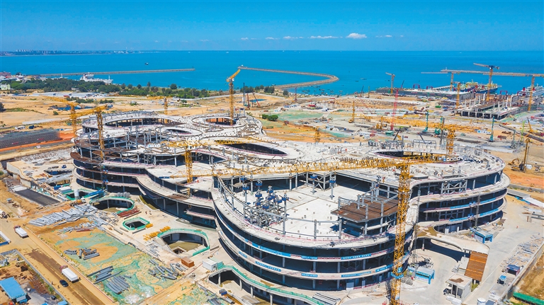 6月17日,海口市国际免税城项目的免税商业综合体进入幕墙安装阶段。据了解,该项目计划总投资128亿元,占地面积约675亩,规划总建筑面积约92.6万平方米。图为免税商业综合体。本报记者 李天平 摄