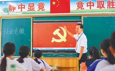 6月16日,在儋州市新州镇英均村小学,老党员、英均村小学校长陈冠华在课堂上为学生们介绍党徽党旗的相关知识,将党史学习教育融入课堂教材。