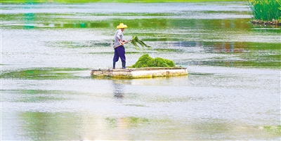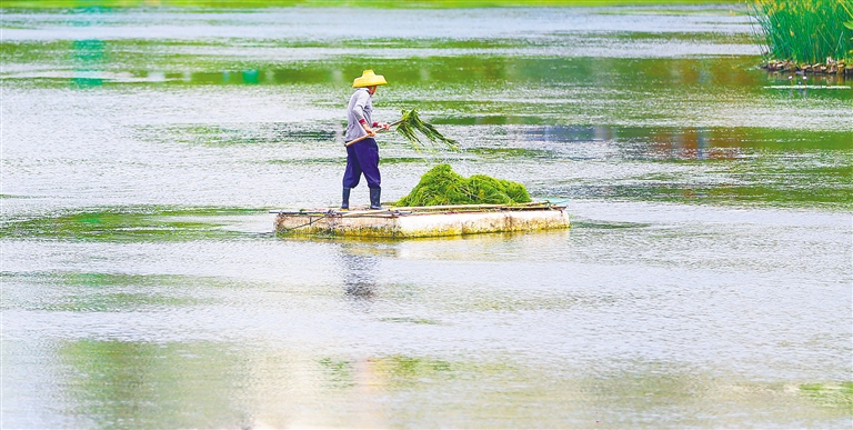 近日,在海口市滨海公园内湖,环卫清洁工在湖中打捞水草。由于前段时间海口持续高温导致水草疯长,使得以往清澈的湖水变成了墨绿色,同时散发出腥臭味道。对此,环卫工不定期打捞湖中水草,还市民一湖碧水。本报记者 张茂 摄