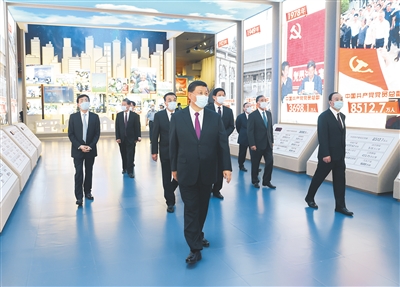 气势磅礴的长城主题漆画、马克思《布鲁塞尔笔记》第四笔记本手稿、一大会址复原场景、革命根据地的创建展板、遵义会议复原景观、党的七大投票箱、开国大典影像、抗美援朝战争中使用过的武器、《解放思想,实事求是,团结一致向前看》讲话提纲、创办经济特区图片、脱贫攻坚数据图表、火神山雷神山医院模型……珍贵的文物实物、翔实的档案资料、生动的图片视频、逼真的复原景观,吸引了习近平等领导同志的目光。他们不时停下脚步仔细观看,认真听取讲解,详细询问有关情况。