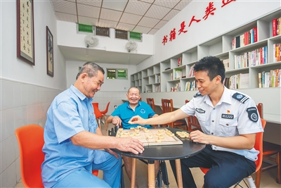 图为6月19日,在海南省救助管理站,党员林志祥和受助人员在阅览娱乐室下棋。