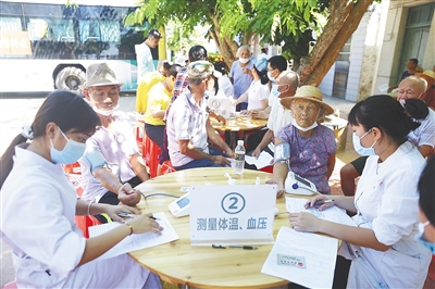 6月19日,在海口市美兰区演丰镇北港村委会,医护人员给当地村民接种疫苗。