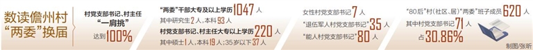 换届换出新气象,儋州市村党支部书记、村主任“一肩挑”比例首次达到100%,实现历史性重大突破。村(社区、居)“两委”班子成员学历水平大幅提升,带头人队伍整体素质提升,村(社区、居)“两委”干部大专及以上学历1047人,占比42.98%,较上届提高18.68个百分点,其中研究生2人,本科93人。村支书、村主任大专以上学历220人,占比75.34%,其中硕士1人,本科19人;35岁以下37人,占比12.67%;女性村党支部书记7人、“退伍军人村党支部书记”35人、“能人村党支部书记”80人,达到“双好双强”预期目标。形成老中青结合的梯次结构,“80后”村(社区、居)“两委”班子成员620人,占25.45%,其中村党支部书记71人,占30.86%。平均年龄明显下降,村(社区、居)支书平均年龄46岁,较上届降低2岁,其他成员40.6岁,较上届降低4.4岁。