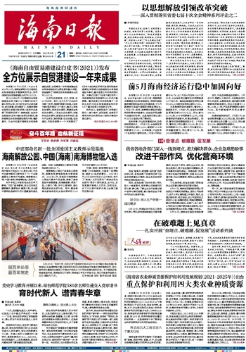 | 海南日报 头版 001 2021-06-211 2021年06月21日 星期一 |