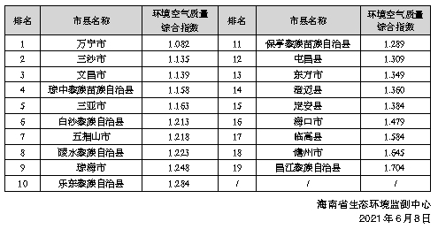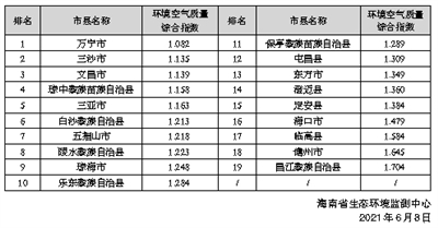 环境空气质量排名靠前的市县分别是万宁市、三沙市和文昌市,排名靠后的市县分别是昌江黎族自治县、儋州市和临高县。2021年5月全省19个市县环境空气质量排名如右: