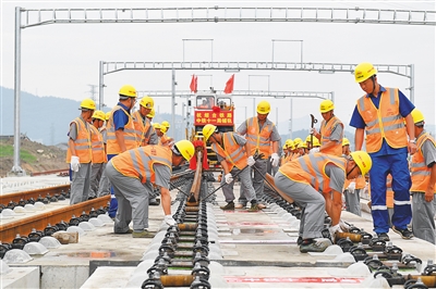 图为中铁十一局的施工人员在杭绍台铁路上进行铺轨作业。 新华社记者 黄宗治 摄