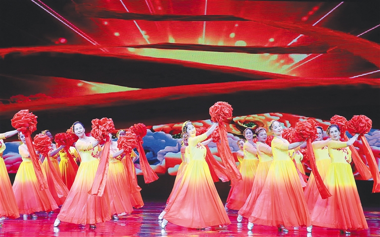 6月24日晩上,保亭黎族苗族自治县举办“践银辉初心·贺百年华诞”文艺晚会,离退休干部表演节目庆祝中国共产党成立100周年。图为部分离退休干部在表演舞蹈《党旗更鲜艳》。 本报记者 武威 特约记者 黄青文 图/文