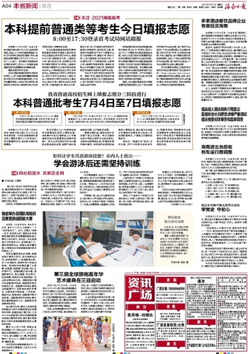 本报海口6月26日讯 (记者尤梦瑜)海南日报记者6月26日从省考试局获悉,我省2021年本科提前普通类、本科艺术校考和须面试的高职(专科)提前批志愿的填报工作于6月27日8:00至17:30进行。考生需点击海南省考试局网站首页上的《2021年海南省普通高校招生志愿填报系统》填报志愿。