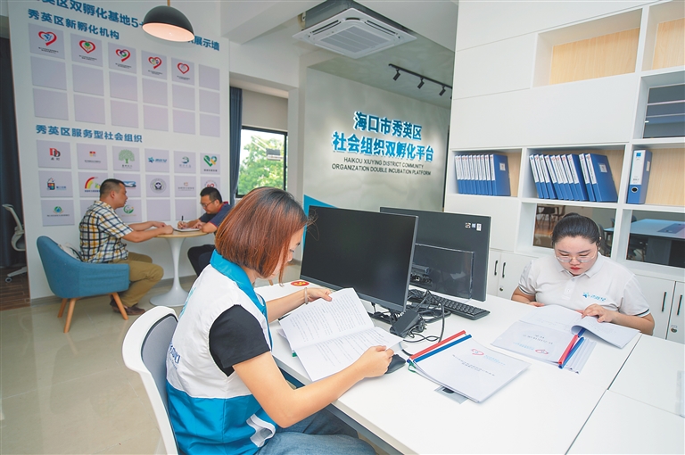6月26日,位于海口市秀英区美德村的社会组织双孵化平台,工作人员正忙碌着。 据悉,该孵化基地采取“专业社工+社区志愿者+社区社会组织+社区村民+社区创投”五社联动形式,以“强组织、优队伍、实服务”的理念,探索具有特色的乡村基层治理模式,以点带面带动村民参与,进一步激发社区活力。