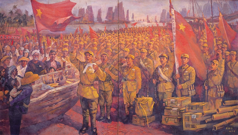 在此之际,本版特别邀请海南著名画家王家儒先生推荐六幅海南画家为中国共产党百年华诞创作的美术作品,这些画作汇聚了海南画家们近年来创作的优秀党史题材及现实题材作品。见微知著,这些画作通过海南画家们独特的视角和手法,展现了中国共产党带领中国人民进行革命、建设、改革,走向中华民族伟大复兴的光辉历程,浓墨重彩抒写新时代中国特色社会主义伟大实践,绘就气象万千、壮阔恢弘的时代画卷。