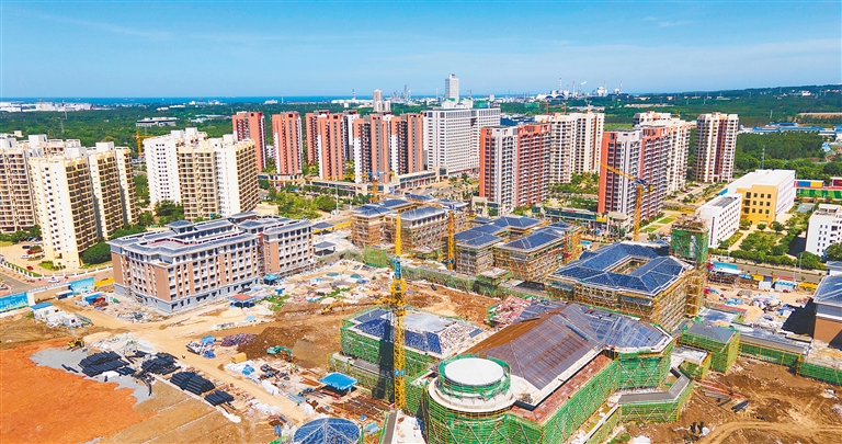 近日,在洋浦经济开发区外国语学校项目工地,一派繁忙施工景象。目前,部分教学楼装修基本完成,正在拆除脚手架。
