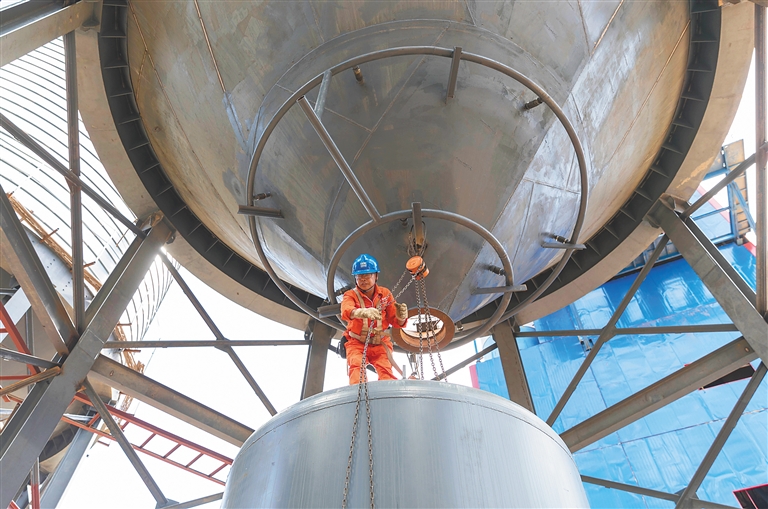 6月26日,在迈湾水利枢纽工程拌合系统施工现场,工人安装混凝土储存设备。迈湾水利枢纽工程是国家重大水利工程项目之一,建成后将为周边市县用水提供保障,并使海口江东新区防洪标准达到百年一遇。本报记者 李天平 通讯员 王建平 图/文