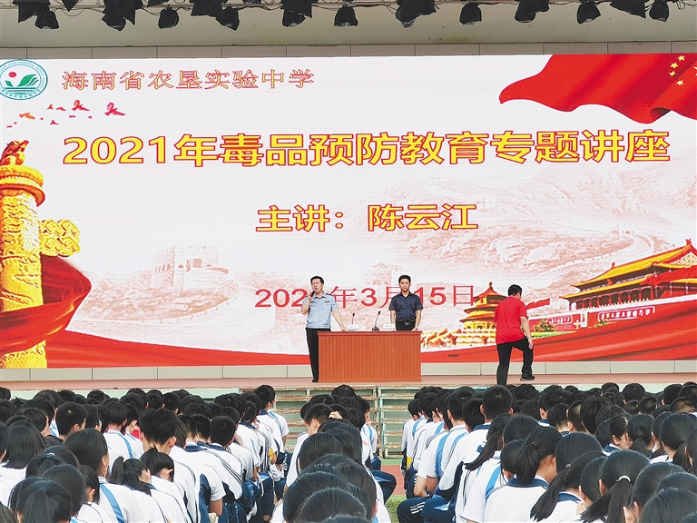 坚持毒品预防宣传教育为先、关口前移,强化治本之策。5月12日下午,在海南省农垦实验中学的支持下,五指山市禁毒办深入校园,举办了一堂禁毒知识讲座,市公安局禁毒大队民警结合真实案例深入浅出地给全校师生讲解了毒品预防知识。