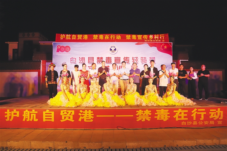 6月17日晚,由白沙公安局主办的“禁毒三年大会战”禁毒宣传轻骑兵文艺巡演活动走进牙叉镇高峰新村。快板《禁毒永不停》、竹木乐器演奏《黎寨晨曲》等节目受到村民欢迎。活动还设置了禁毒知识有奖问答环节。