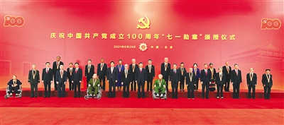 颁授仪式后,习近平等领导同志同“七一勋章”获得者合影留念。