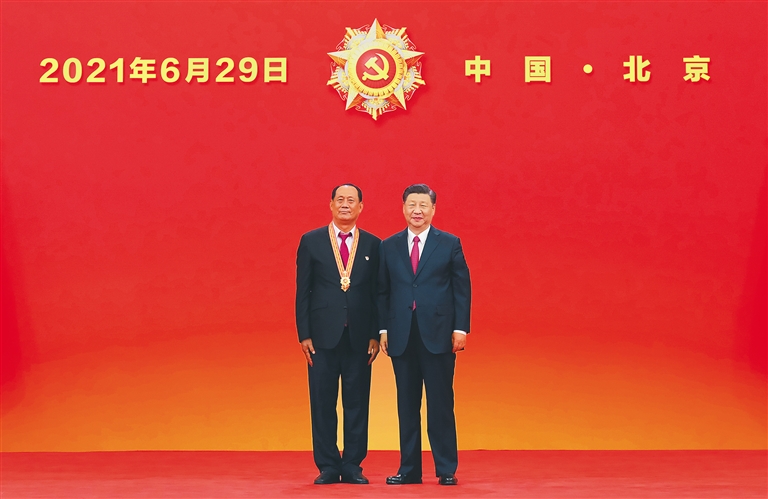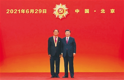 新华社北京6月29日电 弘扬功勋模范精神,奋进伟大复兴征程。庆祝中国共产党成立100周年“七一勋章”颁授仪式29日上午在北京人民大会堂金色大厅隆重举行。中共中央总书记、国家主席、中央军委主席习近平向“七一勋章”获得者颁授勋章并发表重要讲话。习近平强调,一百年来,一代又一代中国共产党人,为赢得民族独立和人民解放、实现国家富强和人民幸福,前仆后继、浴血奋战,艰苦奋斗、无私奉献,谱写了气吞山河的英雄壮歌。在庆祝中国共产党成立一百周年之际,我们在这里隆重举行仪式,将党内最高荣誉授予为党和人民作出杰出贡献的共产党员。