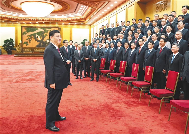 上午11时30分,习近平等来到人民大会堂东大厅,全场响起热烈掌声。习近平等走到受表彰的优秀县委书记中间,同大家亲切交流并合影留念。