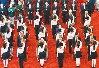 少先队员向“七一勋章”获得者献花
