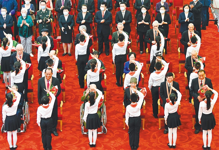 6月29日,庆祝中国共产党成立100周年“七一勋章”颁授仪式在北京人民大会堂金色大厅隆重举行。这是少先队员向勋章获得者献花,敬礼致意。 新华社记者 高洁 摄