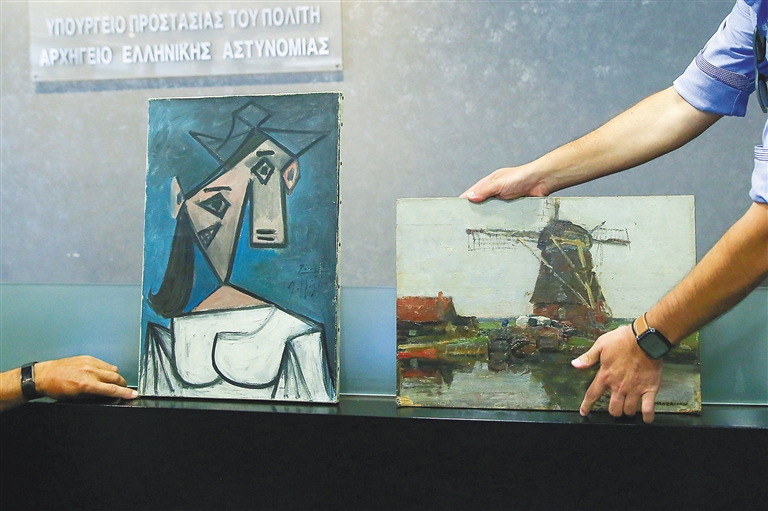 6月29日,警方在希腊雅典展示失窃的毕加索作品《女人头像》(左)和皮特·蒙德里安创作的《磨坊》。