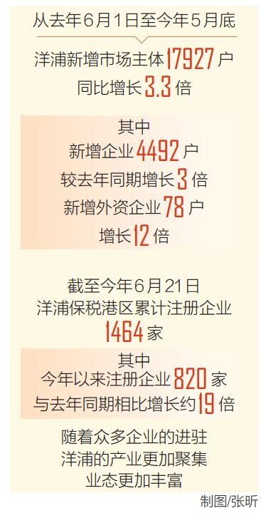 据介绍,从去年6月1日至今年5月底,洋浦新增市场主体17927户,同比增长3.3倍。其中,新增企业4492户,较去年同期增长3倍;新增外资企业78户,增长12倍。截至今年6月21日,洋浦保税港区累计注册企业1464家。其中,今年以来注册企业820家,与去年同期相比增长约19倍。随着众多企业的进驻,洋浦的产业更加聚集,业态更加丰富。